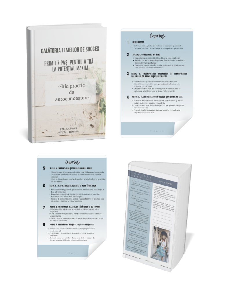 Atât e-book-ul principal, cât și workbook-urile asociate vor fi livrate în format PDF, ușor de accesat și citit direct pe dispozitivul tău. Îți recomand, dacă ai posibilitatea, să le imprimi, pentru a beneficia de o experiență practică și interactivă în lucrul cu aceste materiale.